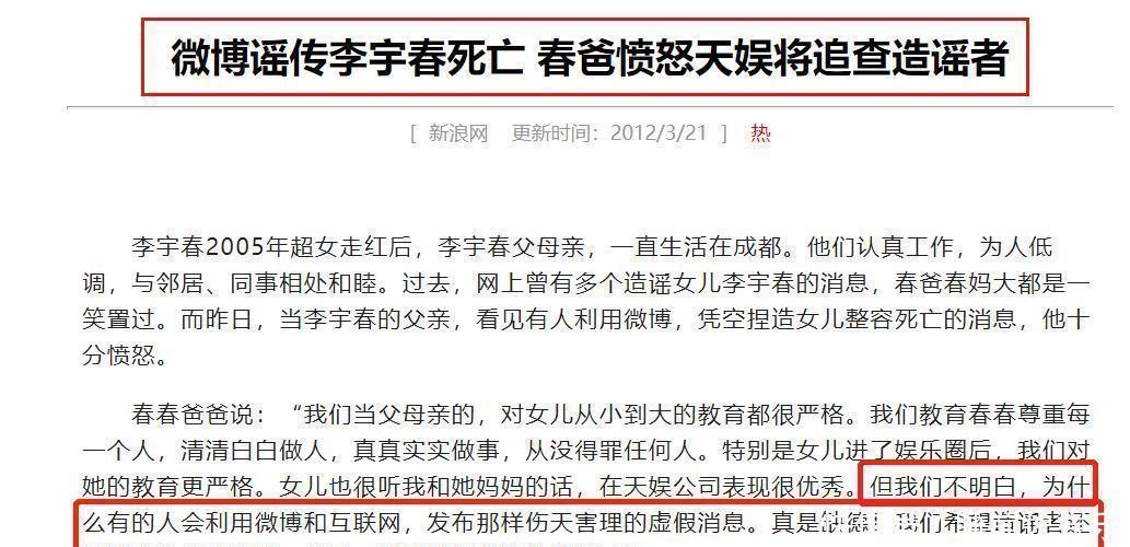 最让人震惊的是,2012年,刚满28岁的李宇春竟被传出去世的谣言,她父亲气得在网上发表声明,狠狠批评那些制造谣言的人,叫他俩多点善心、多点良知。